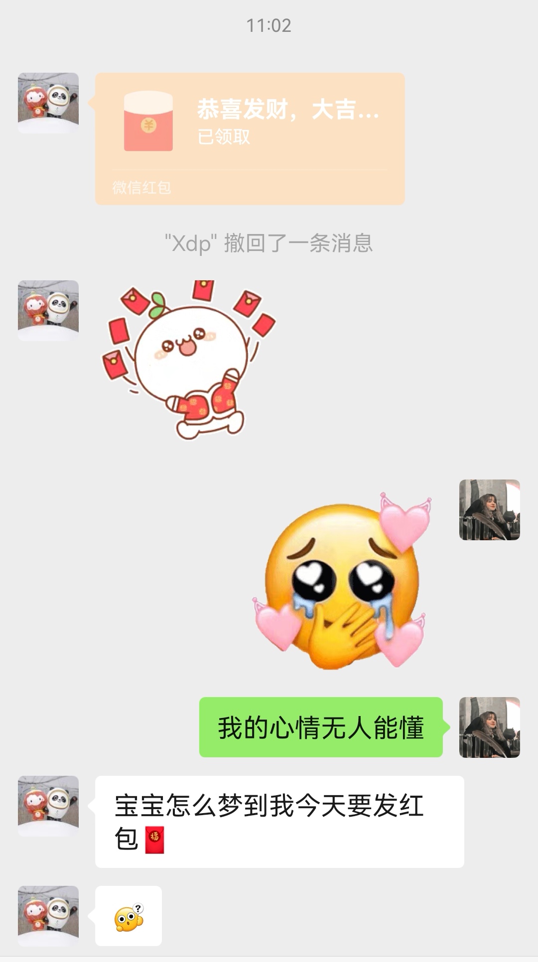 (做梦梦到收到了十张十元的一个红包,在超级开心的时候忽然惊觉很晚了,要看看许先生有没有醒,毕竟昨晚许先生熬夜写代码很辛苦,于是狠狠心从梦中醒来给许先生打电话。再次小睡的时候又做了很难过很差劲的噩梦。醒来收到了许先生的红包…感动幸福开心的泪水顺着黄河流到了松花江…是被小天使男朋友许先生捧在手心里放在心尖上的幸福小女孩)